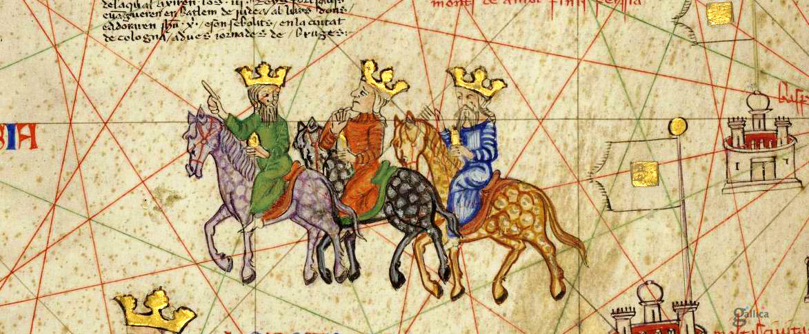 This atlas is the first known representation of the world as a whole, attributed to Abraham Cresques, a Majorcan Jewish cartographer from Palma. Above the representation of the Magi, the legend reads: “Aquesta provincia és appellada Tàrsia de la qual aixiren los .III. reys fort savis” translated as: Tarsia, from where the Three Wise Kings came out. In front of the Three Wise Men, is written: TARSSIA.